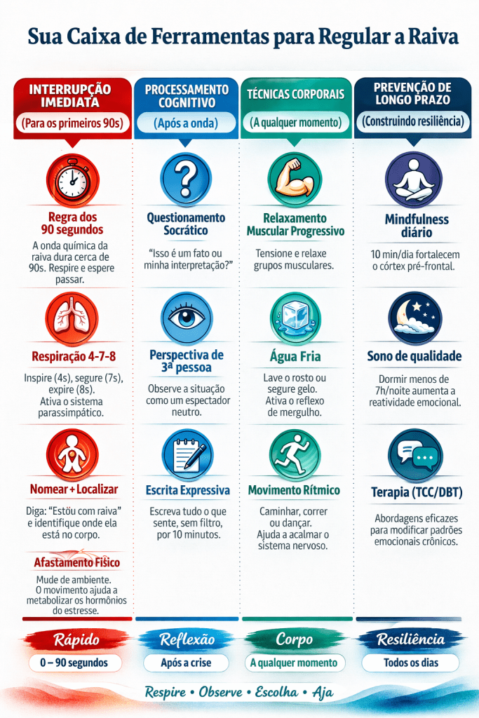 Essa é a “Caixa de Ferramentas para Regular a Raiva”. Um guia prático, dividido em quatro etapas fundamentais, para ajudar você a assumir o controle.